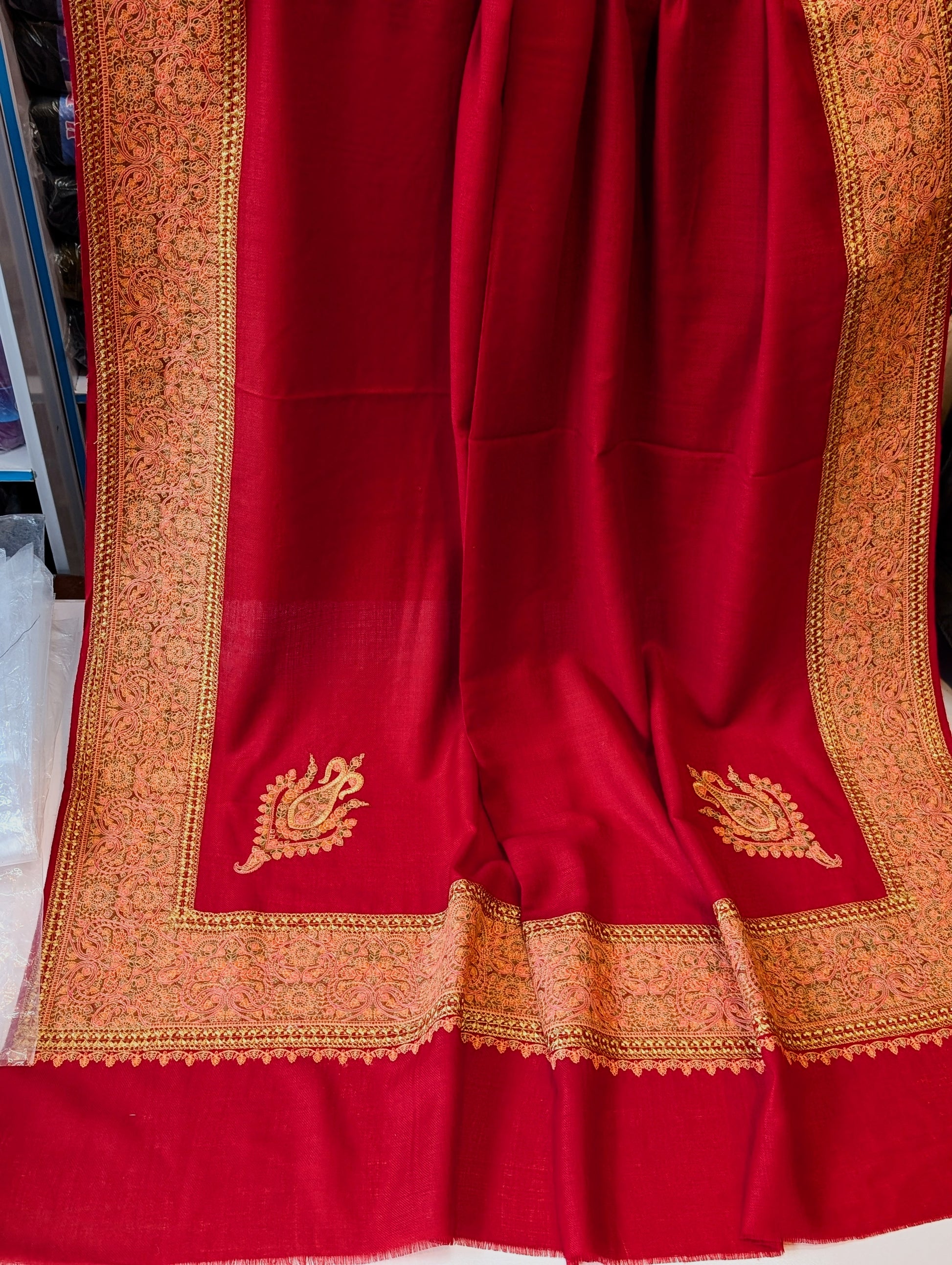 Kashmiri Shawl | Wide Border Papermache Tilla Embroidery Made in Kashmir Pure Pashmina | Maroon