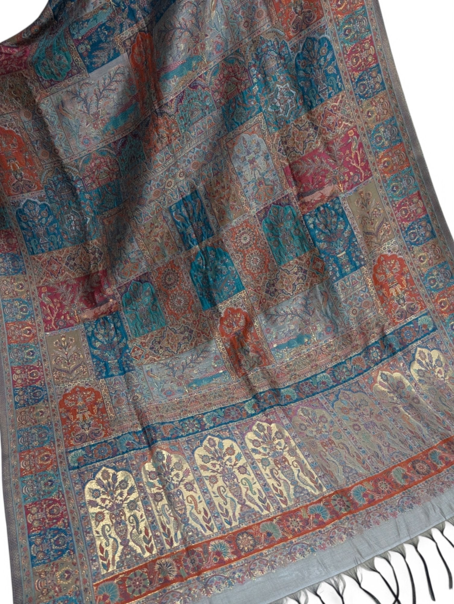 A beautiful Kani Silk Dupatta/Shawl woven into multicolored floral patterns .There is Gold thread work as well which was very hard to capture. We have a video available if you would like to see please message us.