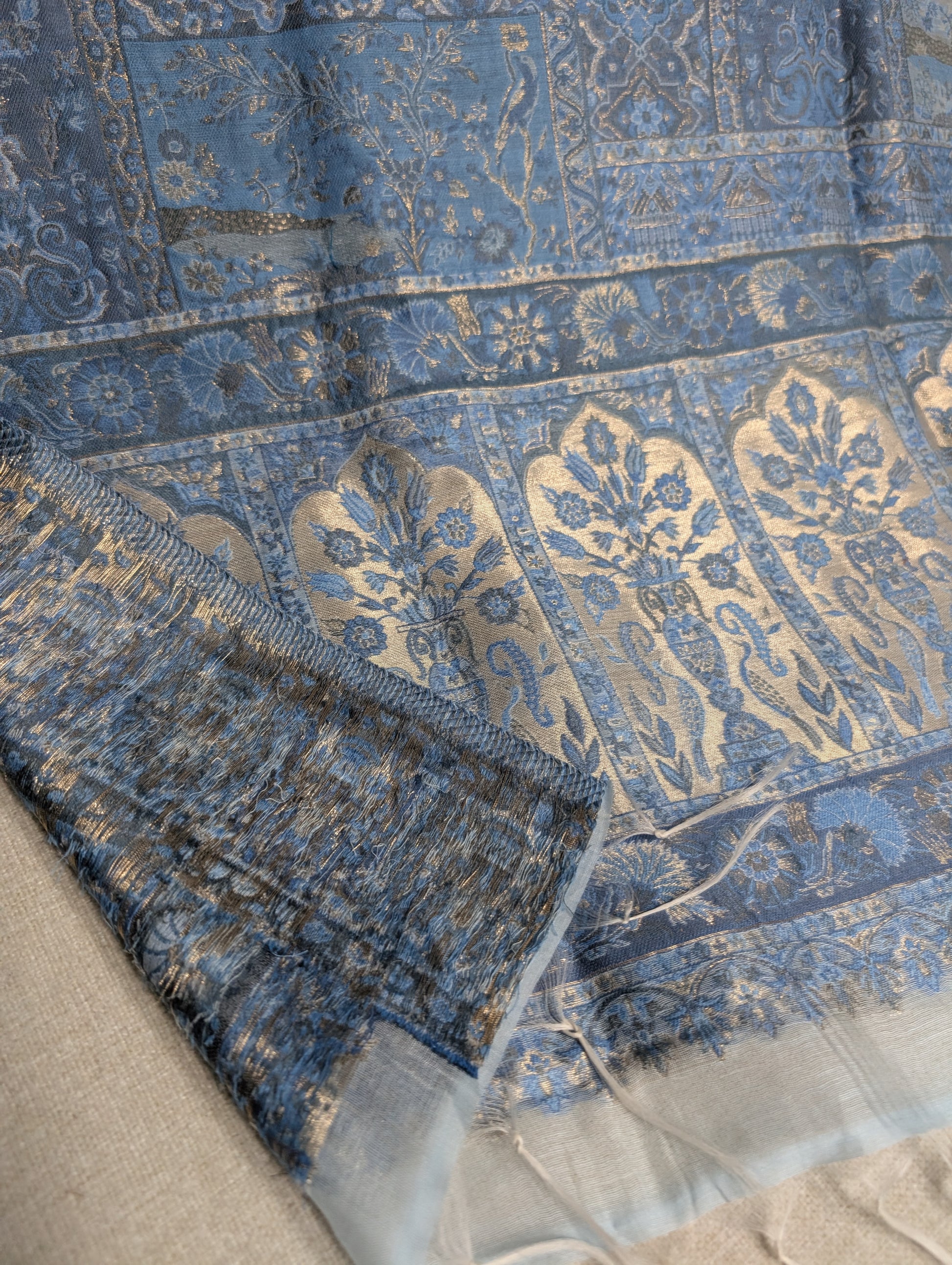 A beautiful Kani Silk Dupatta/Shawl woven into multicolored floral patterns .There is Gold thread work as well which was very hard to capture. We have a video available if you would like to see please message us.