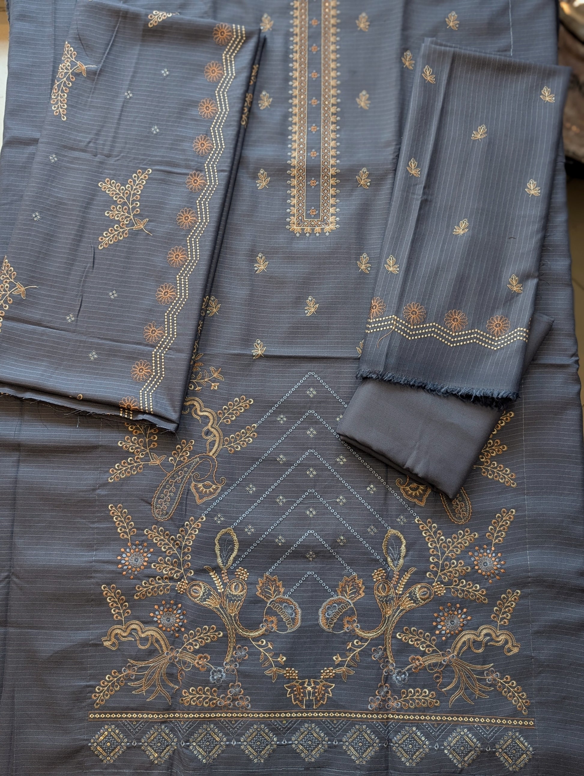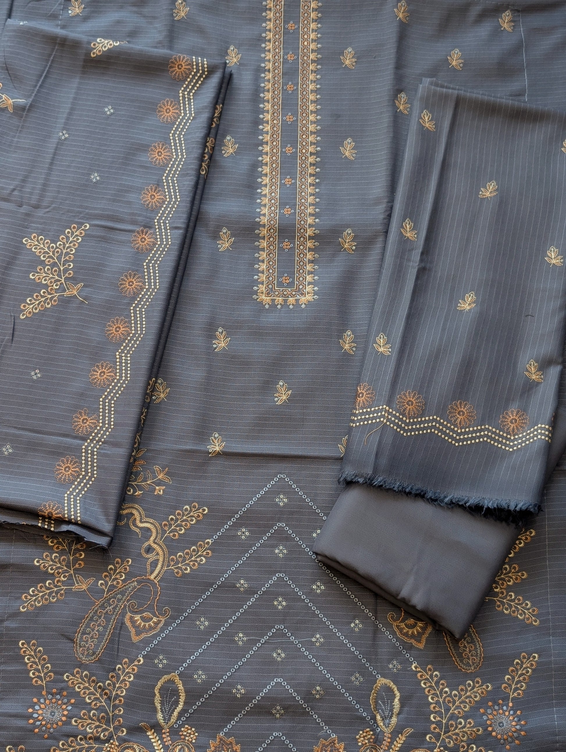 Marina (Doria) 3 Piece Embroidered Suit Multi Fancy Embroidery With Marina Shawl | Grey