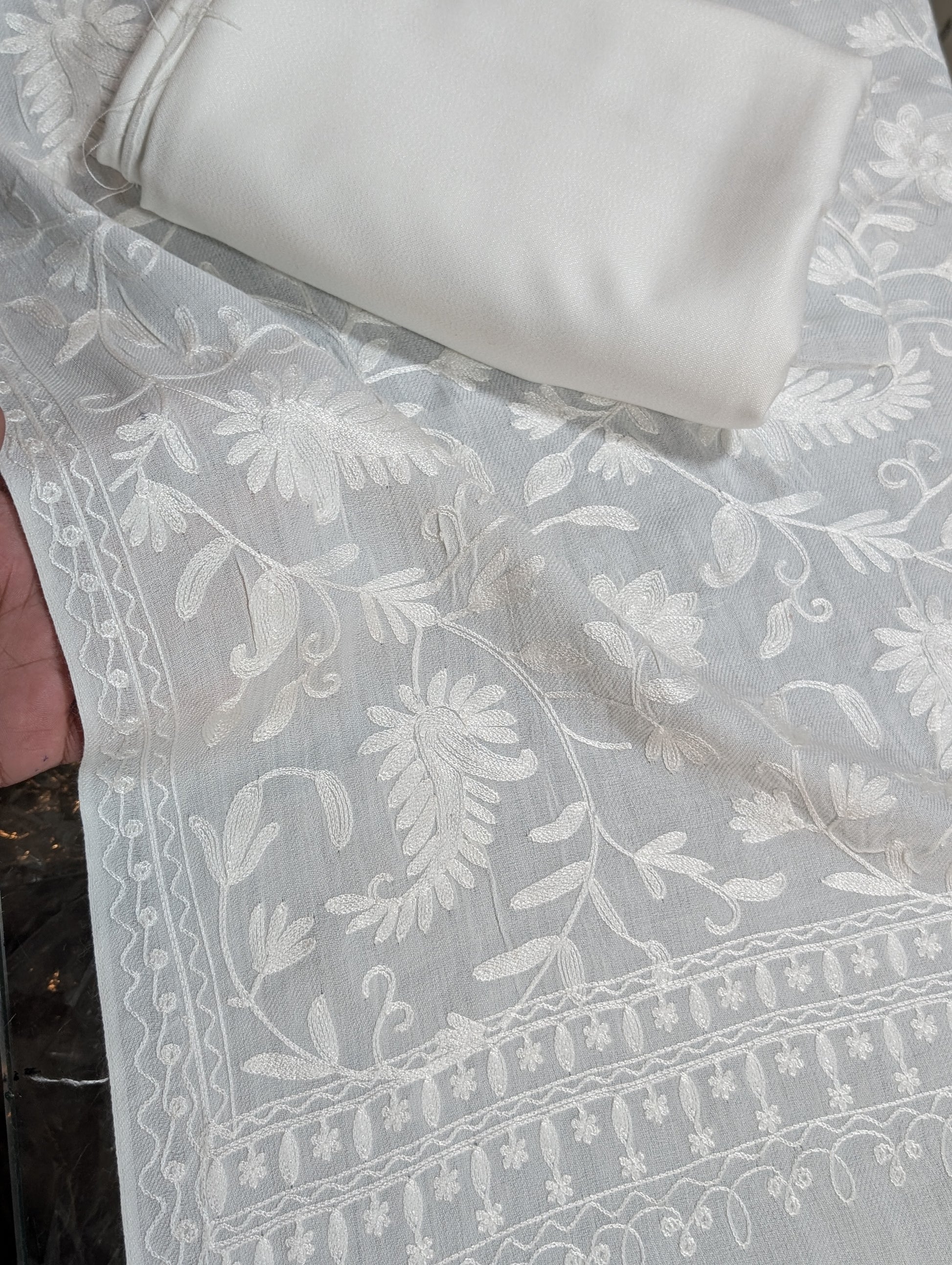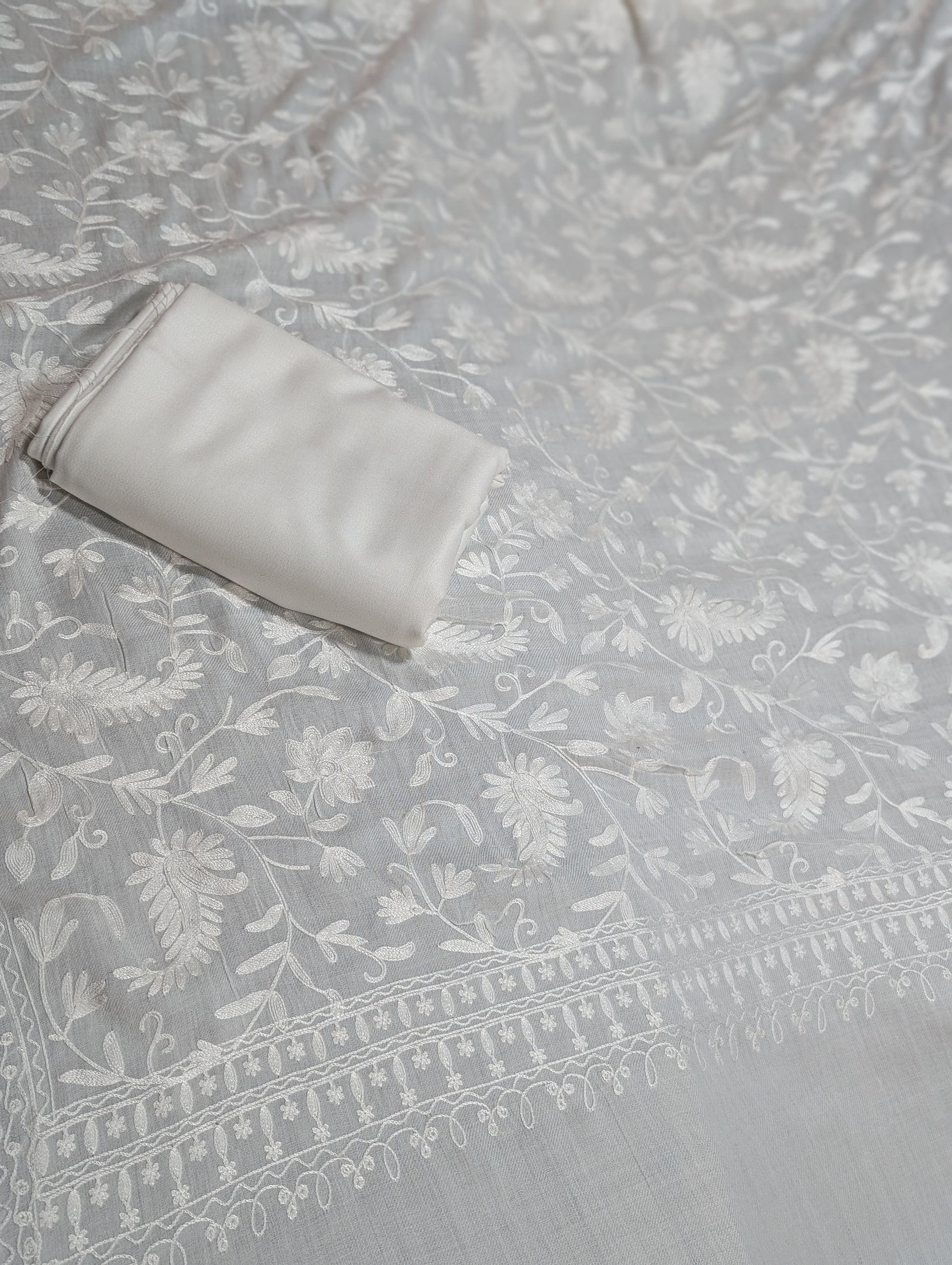 Pashmina 3 Piece Suit | Embroidered Shawl with Plain Suit Marina White
