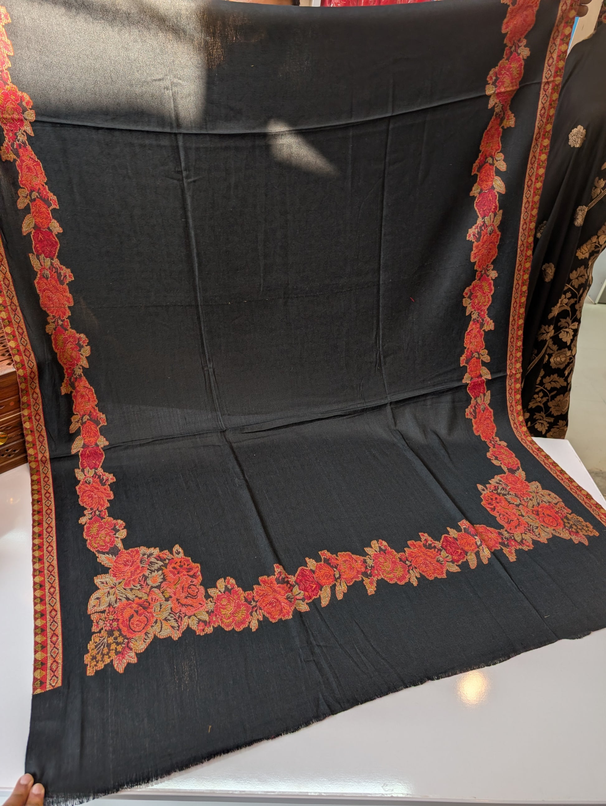 Pashmina Wool Kani Border Shawl Gulabkar Border | Black